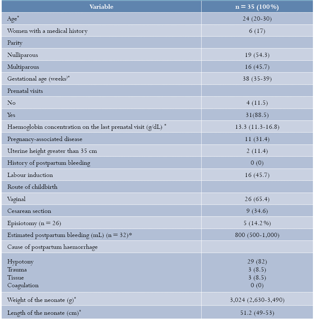 Materials and methods: A series of cases of pregnant women who presented PPH after vaginal delivery or cesarean section between February 1 and October 31, 2016, in a public intermediate complexity institution in Bogotá. Consecutive sampling was used. Sociodemographic, clinical and risk factors for PPH were measured. Variables measured were the cause of PPH, the degree of shock, estimated postpartum bleeding, frequency of activation of the "obstetric red code," interventions performed, admission to an intensive care unit, blood transfusions, and maternal mortality. A descriptive analysis was performed.