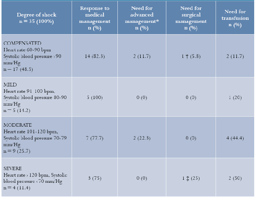 Responses to the treatments instituted according to the degree of shock at the time of case identification are shown in Table 2. The stratified analysis shows that a smaller proportion of women with the highest degree of shock responded to medical management and had a higher frequency of transfusions.