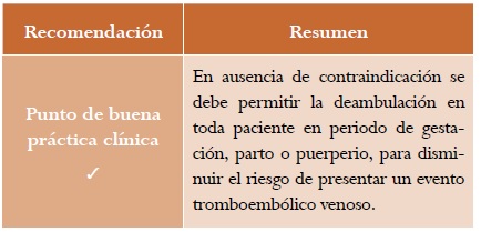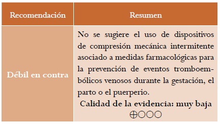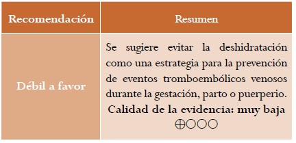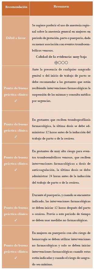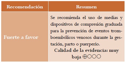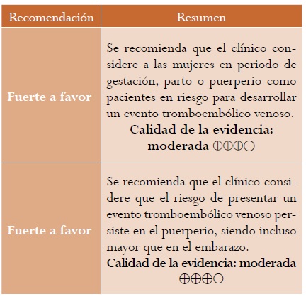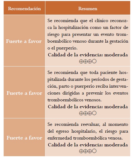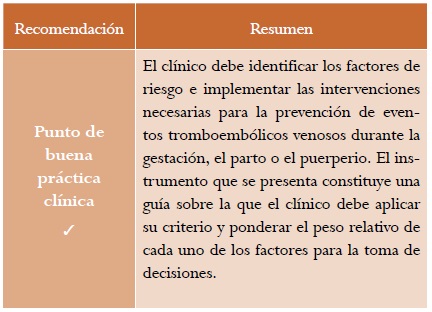 Resultados: se presenta la versión corta de la guía de práctica clínica para “la prevención de eventos tromboembólicos venosos durante la gestación, el parto o el puerperio”, con sus respectivas recomendaciones, evidencia de soporte y criterios de auditoría.