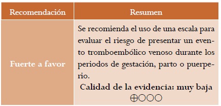 La revisión sistemática de la literatura no recuperó ningún estudio que comparara la seguridad o la efectividad de las escalas disponibles en población obstétrica. A pesar de que el panel de expertos reconoce que en la actualidad el clínico cuenta con diferentes aproximaciones para definir el momento apropiado para el inicio de tromboprofilaxis24, 31, los expertos expresaron consistentemente su preocupación acerca de la metodología implementada que soporta la construcción de dichas escalas disponibles32,33.