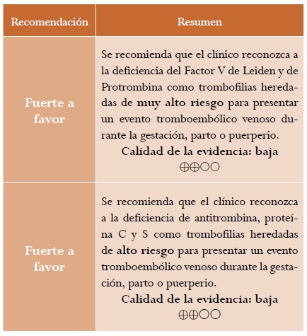 Una revisión sistemática (puntaje AMSTAR 8/11) evaluó la asociación entre la presencia de trombofilias y el desarrollo de eventos tromboembólicos venosos durante la gestación en pacientes no hospitalizadas16. Basados en esta revisión sistemática se pudo establecer que la deficiencia homocigótica (OR [razón de oportunidad] = 34,4; IC 95 %: 9,86-120,05) y heterocigótica (OR = 8,32; IC 95%: 5,44-12,70) del factor V de Leiden, al igual que la deficiencia homocigótica (OR = 26,36; IC 95 %: 1,24-559,2) y heterocigótica (OR = 6,8; IC 95 %: 2,46-18,7) de protrombina constituyen trombofilias de muy alto riesgo para presentar un evento tromboembólico venoso. Por su parte, la deficiencia de antitrombina (OR = 4,69; IC 95 %: 1,3-16,96), proteína C (OR = 4,76; IC 95 %: 2,15-10,57) y de proteína S (OR 3,19; IC 95 %: 1,48-6,88) constituyen trombofilias heredadas de alto riesgo que incrementan el riesgo de presentar esta complicación asociada a la gestación.