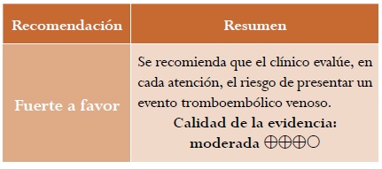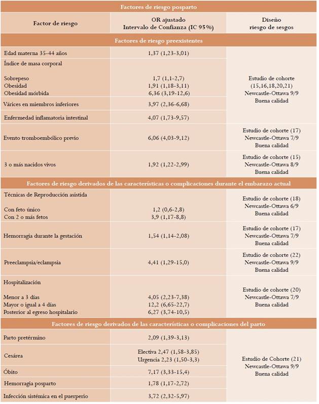 Un estudio observacional retrospectivo15 ensambló dos cohortes, una de mujeres expuestas y otra de no expuestas, con el fin de determinar si los periodos de gestación y puerperio constituyen un factor de riesgo para desarrollar un evento tromboembólico venoso (ETV). Basados en este estudio se pudo establecer que el periodo de gestación (RDI [razón de densidad de incidencia] = 3,5; IC 95 %: 2,8-4,3) y de puerperio (RDI = 11,9; IC 95 %: 9,8-14,5) incrementan la frecuencia de eventos tromboembólicos venosos. Esta asociación mostró un gradiente dosis respuesta acorde al trimestre de gestación (primer trimestre: RDI = 1,6; IC 95 %: 0,9-2,8; segundo trimestre: RDI = 2,1; IC 95 %: 1,3-3,4 y tercer trimestre: RDI = 6,1; IC 95 %: 4,7-7,9). La calidad de la evidencia fue moderada por algunas limitaciones en la precisión de los resultados.