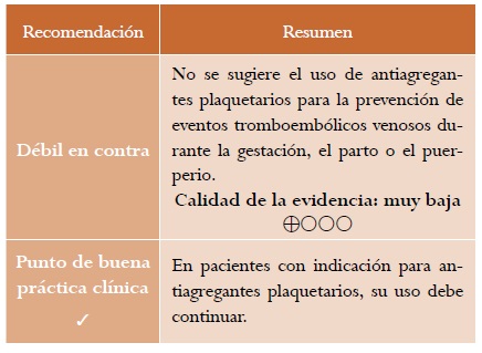Una revisión sistemática de la literatura, que identificó nueve ensayos clínicos controlados para un total de 555 participantes28, evaluó la efectividad y la seguridad del uso de antiagregantes plaquetarios para la prevención de eventos tromboembólicos venosos en pacientes sometidos a procedimientos quirúrgicos o que poseen un alto riesgo para desarrollar enfermedad tromboembólica. Basados en esta revisión sistemática se pudo establecer que el uso de antiagregantes redujo la frecuencia de episodios de trombosis venosa profunda (OR = 0,59; IC 95 %: 0,38-0,92) pero no de tromboembolismo pulmonar (OR = 0,38; IC 95 %: 0,10-1,43) o de muerte por evento tromboembólico venoso (OR = 0,93; IC 95 %: 0,50-1,71). No se reportaron casos de sangrado mayor en la población expuesta. La calidad de la evidencia es muy baja por limitaciones en la precisión, aplicabilidad, consistencia y riesgo de sesgos.