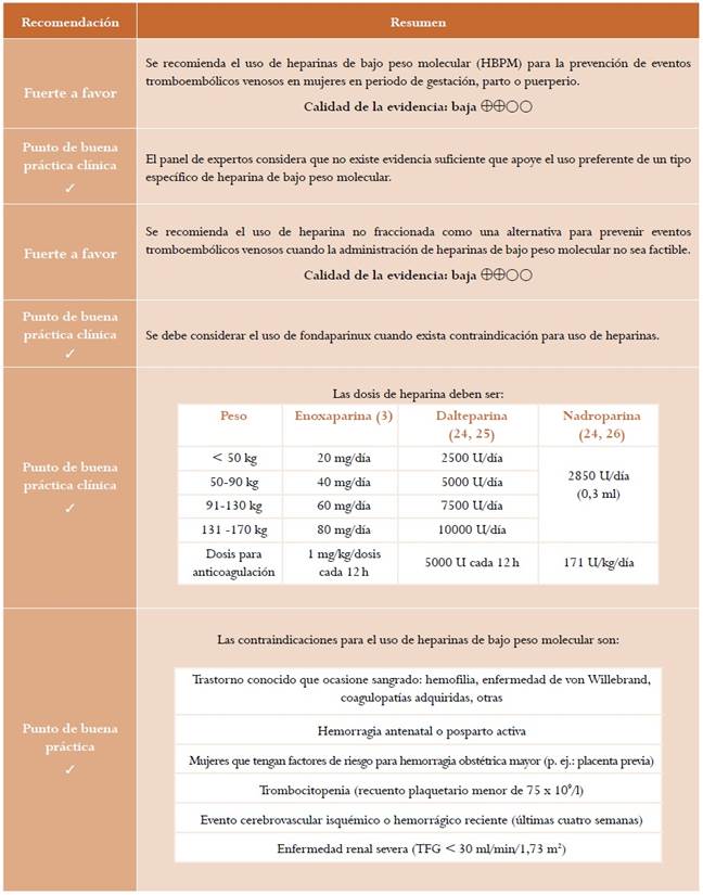 La revisión sistemática de la literatura no recuperó estudios que compararan la seguridad y la efectividad según el tipo de heparinas de bajo peso molecular en población obstétrica. No obstante, se recuperó una revisión sistemática de mala calidad que no permite extraer mayores conclusiones al respecto27. El GDG emitió un punto de buena práctica y hace un llamado al desarrollo de ensayos clínicos controlados en este campo.