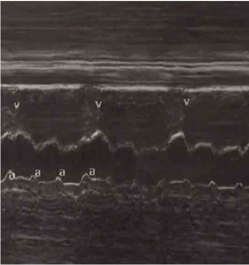 Al ingreso al HUCSR se realizan pruebas de bienestar fetal las cuales son normales; posteriormente se realiza ecografía de detalle en la cual no se observan signos de hidrops fetal ni otras alteraciones anatómicas. Finalmente, se realiza ecocardiograma fetal donde se encuentra situs solitus, situs vascular normal, eje cardiaco de 45º, relación cardiotorácica de 0,55, corte de cuatro cámaras normal, concordancia auriculoventricular y ventriculoarterial, inserción valvular normal, foramen oval permeable, flujo hacia aurícula izquierda, movimientos de paredes libres de ventrículos de amplitud normal; se observa imagen hiperecogénica a nivel del nodo sinoauricular sugestiva de fibroelastosis endocárdica (figura 1). No se evidencia ritmo sinusal, se documenta disociación auriculoventricular en Modo M ((figure 2), con frecuencia cardiaca ventricular de 50 lpm y frecuencia auricular de 135 lpm, segmentos PR variables, e istmo aórtico con flujo anterógrado. No hay evidencia de disfunción diastólica dada por ductus venoso normal.