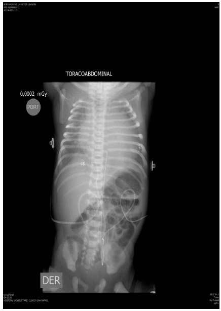 En salas de cirugía se obtiene recién nacida vigorosa, con peso y talla adecuados para la edad gestacional; Ballard de 38 semanas, con adecuada adaptación neonatal a pesar de presentar frecuencia cardiaca de 50 lpm. Inicialmente sin signos de bajo gasto o de dificultad respiratoria. Aproximadamente a las 12 horas de vida la recién nacida presenta dificultad respiratoria, llenado capilar lento con tendencia a la hipotensión arterial, por lo cual se decide iniciar ventilación mecánica invasiva; se intenta mejorar la frecuencia cardiaca con medidas farmacológicas, sin respuesta de la paciente; se toma radiografía de tórax (figura 3) que muestra cardiomegalia. Se informa a cirugía cardiovascular quienes realizan implantación de marcapasos programado epicárdico unicameral ventricular, con frecuencia cardiaca de 120 lpm y umbral de 0,9. Posterior a la cirugía la recién nacida es trasladada a la unidad de cuidados intensivos pediátricos para continuar manejo integral. En el ecocardiograma de control se evidencia marcapasos unicameral de demanda ventricular (VVI), con un corazón estructuralmente sano y adecuada función biventricular. La evolución de la recién nacida al año de vida ha sido satisfactoria, con adecuado desarrollo neurológico y ponderal.