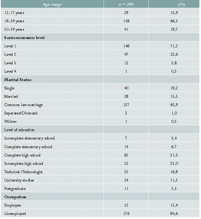 The total number of pregnant women participating was 208, but 20 were excluded: 5 failed to complete the surveys and 15 had a recommendation to refrain from doing any physical exercise. 119 were affiliated to the Healthcare Provider Institutions in Barranquilla. The mean age of the pregnant women was 23.6 ± 6.51 years; 66.3 % were in the age range between 18 and 29 years of age. Table 1 shows the socio-demographic characteristics of the participants. 71.2 % were from socio-economic level 1, 65.9% were common-law marriage, 31.3 % reported having completed high school education, and 84.6 % were unemployed.