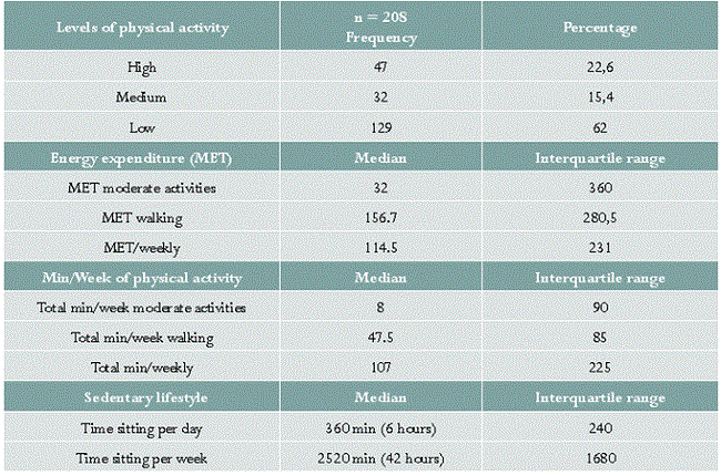 In terms of the level of physical activity, 62 % of the pregnant women had a low level of physical activity and 15.4 % a medium level. There was no vigorous physical activity (0 minutes), and therefore there were no metabolic equivalents (MET) of vigorous exercise; the type of physical activity that contributes the most to energy expenditure is walking (156,7 MET). This is consistent with the total number of minutes walking per week (47.5 min). At least 50 % of the patients reported a sedentary lifestyle, with over 6 hours sitting or lying down per day (table 2).
