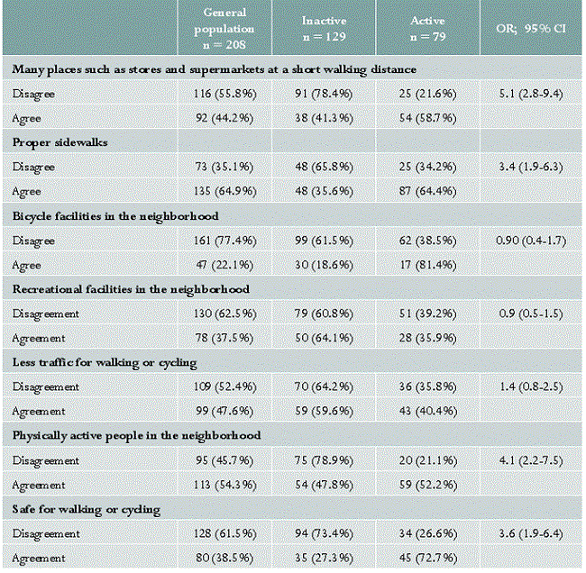 Table 3 illustrates the relationship between the levels of physical activity and the socio-environ-mental drivers. The risk factors identified for a low physical activity were living far away from shops and supermarkets to walk or cycle (OR = 5.1; 95 % CI: 2.8-9.4); sidewalks in poor condition (OR = 3.4; 95 % CI: 1.9-6.3); the perception of few people physically active in the neighborhood (OR = 4.1; 95 % CI: 2.2-7.5); and insecure neighborhood during the day or evening to walk or ride a bicycle (OR= 3.6; 95 % CI: 1,9-6,4).