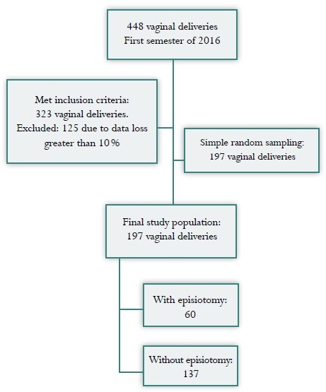 There were 448 patients with vaginal delivery in the time period between January and June 2016; of them, 323 met the inclusion criteria, 125 (39%) were excluded because of data loss of more tan 10% and incomplete documentation in the clinical record. A simple random sample of 197 patients was obtained (Figure 1). Episiotomy was performed in 60 pregnant women, with a frequency of 30.45% (95% CI: 24.1-37.3).