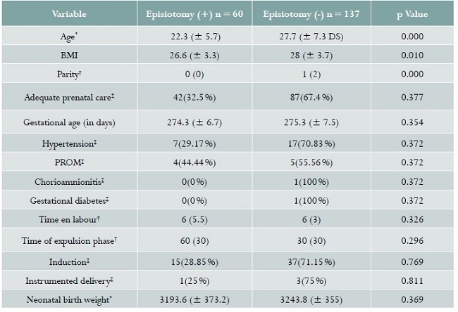 Statistical analysis. In order to determine frequency, the numerator used was the total number of patients in whom episiotomy had been performed, and the denominator was the total number of patients with vaginal delivery who met the inclusion criteria. Baseline sociodemographic and clinical variables are presented comparing the women that underwent episiotomy versus women who did not. Continuous variables are summarised by means of central trend and scatter measurements, and categorical values are presented as proportions. The Shapiro Wilk normality test was used for normality evaluation of continuous variables. Normal distribution variables were compared using Student’s t test, while the Mann-Whitney test was used for variables with a non-normal distribution; categorical variables were compared using the chi square test or Fisher’s test. A bivariate analysis was performed with the established variables. Association was established by means of the prevalence ratio and its respective 95% confidence interval (95% CI). Finally, a logistic regression multivariate analysis was performed in order to determine the association between episiotomy and primiparity, adjusting for potential confounding factors. The stepwise procedure was used with entry and exit probability of 0.20 and 0.05, respectively; moreover, the clinical criterion was also considered besides the statistical criterion for the selection of variables. The analysis of the data obtained was performed using the Stata v. 9 software package.