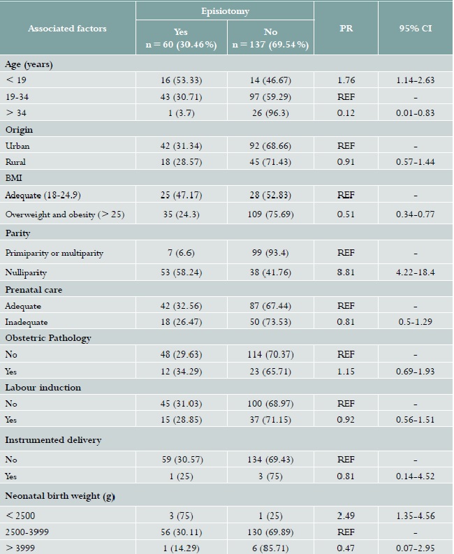 When comparing the patients with and without episiotomy in terms of baseline sociodemographic and clinical characteristics, clinically and statistically significant differences were found for maternal age and parity. Although there were statistical differences in body mass index (BMI), they were not clinically relevant. There were no differences in existing maternal pathology at the time of second stage, or in neonatal birth weight (Table 1). The bivariate analysis of factors associated with the use of episiotomy showed that in nulliparus patients (PR = 8.81; 95% CI: 4.22-18.4) and in patients under 19 years of age (PR = 1.76; 95% CI: 1.14-2.63) the frequency of episiotomy performed by the treating physician was higher. Protective factors were BMI > 25 (PR = 0.51; 95% CI: 0.34-0.77) and age over 34 years (PR = 0.12; 95% CI: 0.01-0.83), with no differences in terms of whether the delivery was induced or spontaneous, instrumented, or the foetal weight was greater than 3999 g (Table 2).