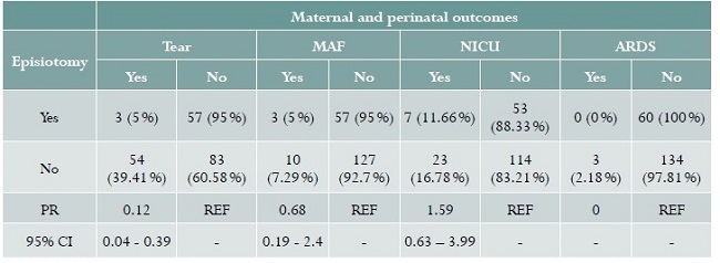 Like in our study, Santos Oliveira et al. Reported a higher frequency of tears when episiotomy was not performed (OR = 26.03; 95% CI: 18.13-37.37)21.