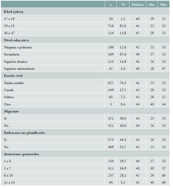 De 853 candidatas a ingresar al estudio, seis no ingresaron porque no cumplieron con los criterios de selección, y cinco gestantes se negaron a participar, por lo que la muestra final fue de 842 gestantes. El 85,0 % de gestantes se encontraba entre los 20 a 35 años; 67,6 % tenía nivel educativo secundario; 74,5 % con unión estable; la mitad era migrante, y el 44,3 % presentó embarazo no planificado. El 66,6 % presentó entre 1 a 7 atenciones prenatales. Los puntajes obtenidos tuvieron una mediana de 41 puntos, con un mínimo de 25 y un máximo de 55 puntos; la mediana de los puntajes de calidad se incrementa conforme al número de atenciones prenatales (tabla 1). El 29,6% consideró la atención prenatal de calidad (puntaje igual o superior a 45 que se consideró como punto de corte de percepción de buena calidad).