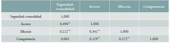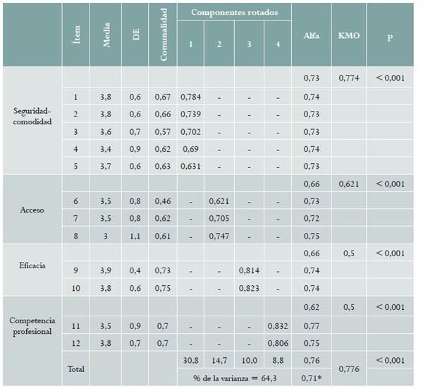 Con respecto a la validez de constructo se identificaron cuatro dimensiones: seguridad-comodidad, acceso, eficacia y competencia profesional, que explicaron el 64,3 % de la varianza. La prueba de chi cuadrado de Bartlett fue significativa, validando el supuesto de que existen correlaciones adecuadas entre los ítems (X2 = 2820,3; gl = 78; p < 0,001), la correlación KMO determinó el supuesto de que existe fuerza de relación entre los ítems (KMO = 0,776). La confiabilidad del instrumento fue adecuada, con un coeficiente alfa de Cronbach de 0,76, y un coeficiente de consistencia interna bajo la correlación de Spearman-Brown de 0,71 que se consideraron adecuados (tabla 2).