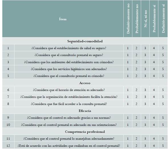 Procedimiento. Para la construcción del instrumento se procedió a realizar la revisión bibliográfica de las actividades en las atenciones prenatales, tomando información de la guía nacional10 y literatura especializada1,11-13, y sobre calidad de la atención9,14-17. Posteriormente, por medio del análisis factorial, se construyeron las dimensiones agrupando las actividades realizadas en las atenciones prenatales y lo definido en la literatura de calidad; se elaboraron ítems para cada dimensión con un escala tipo Likert, así: Definitivamente no = 1, Probablemente no = 2, Ni sí, ni no = 3, Probablemente sí = 4 y Definitivamente sí = 5; los puntajes se determinaron de acuerdo con los ítems encontrados. El formulario inicial de la escala contenía trece ítems, pero uno de ellos, “Considera Validez de constructo, validez concurrente y confiabilidad de una escala de percepción de la calidad de la atención prenatal en gestantes peruanas que en el establecimiento tiene seguridad de no infectarse”, fue excluido pues arrojó resultados contradictorios porque en términos estadísticos no se consideró estable, por lo que finalmente el cuestionario presentó 12 ítems. Para la calificación de la escala las respuestas Likert se reemplazaron por sus puntajes numéricos, calculándose en cada paciente la sumatoria de los 12 ítems con un rango de entre 12 a 60 puntos: el primero correspondió al rango mínimo de las doce respuestas y el segundo al rango máximo; se determinó que a mayor puntaje mayor percepción de la calidad de la atención prenatal. Se procedió a realizar estudios piloto en gestantes para mejorar la calidad de las preguntas, el entendimiento y las respuestas18,19. El cuestionario fue aplicado vía entrevista estructurada donde un encuestador entrenado registró la información. La información fue digitada en una base de datos para el análisis posterior. La escala fue empleada como instrumento en tres tesis de posgrado que evaluaban el abandono de la atención prenatal, entre cuyas causas se evaluó la percepción de una mala calidad de la atención18-20.