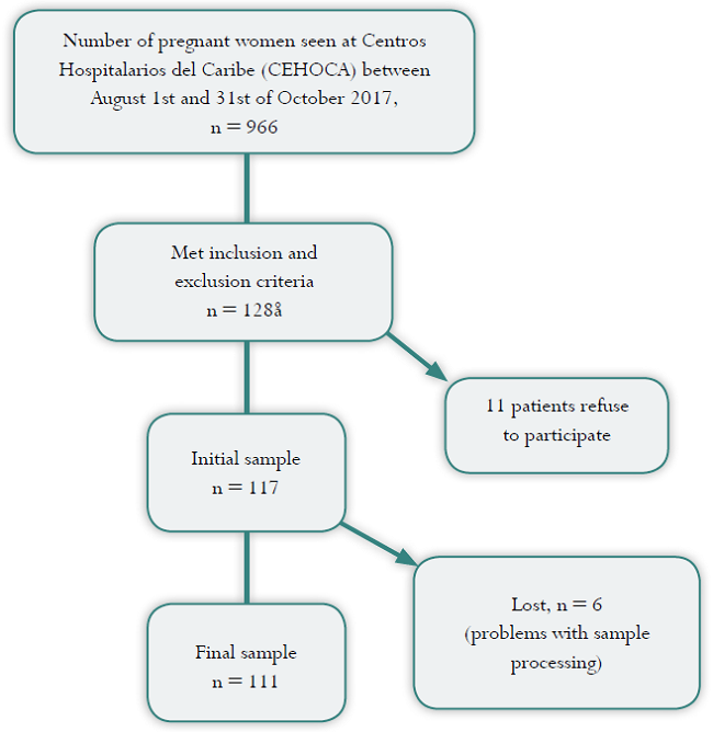 A total of 966 pregnant women were seen at Centros Hospitalarios del Caribe (CEHOCA) in the obstetric outpatient clinic or admitted for vaginal term delivery or elective cesarean section between August 1 and October 31, 2017. Of this universe, 117 patients met the study inclusion and exclusion criteria. During the course of the study, 6 participants were excluded due to issues with specimen processing or incomplete data, so the final sample consisted of 111 pregnant women (Figure 1).