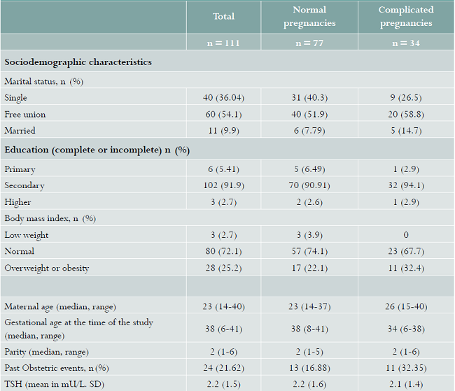 The median age in the sample analyzed was 23 years, with a range between 14 and 40. Gestational age at the time of the test ranged between 6 and 41 weeks, spanning the three trimesters of pregnancy. Median parity was 2. Based on the data taken from the clinical records, most of the women had normal weight, followed in frequency by the overweight and obesity groups. The majority of the women reported being in a de facto marital relationship, and the most frequent level of schooling was secondary education (complete or incomplete) (see Table 1). Of the 111 pregnant women, 77 did not have reported pregnancy-related complications, while miscarriage was diagnosed in 11 cases, 6 had threatened or actual preterm delivery, and 17 were diagnosed with hypertensive disorders of pregnancy.