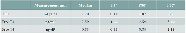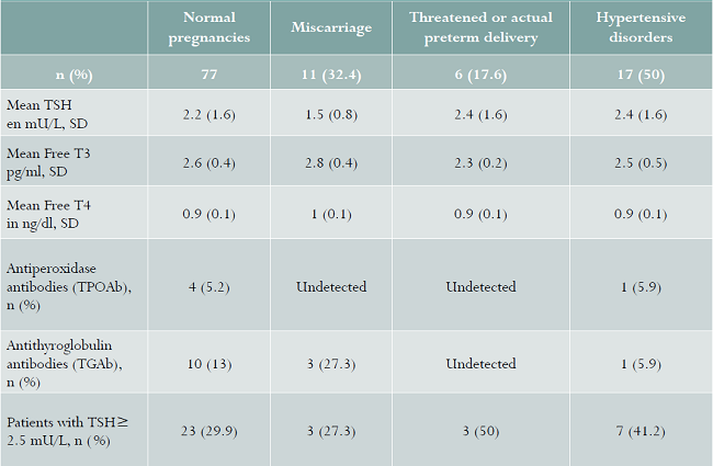 Statistical analysis. Data were analyzed using the Epi-Info 7® software package19. Continuous variables were expressed as means and standard deviations, or medians and ranges according to normality. In pregnant women with no complications, 3rd and 97th percentiles were determined for the TSH and free T3 and T4 values. Categorical variables were expressed as proportions. Prevalence was calculated as the number of women with positive TG or TPO antibodies/number of surveyed women, and was categorized by positive antibody type and thyroid function (normal or hypothyroidism). To determine the association with obstetrical complications, the groups of women with positive and negative antibodies were compared using odds ratio (OR).