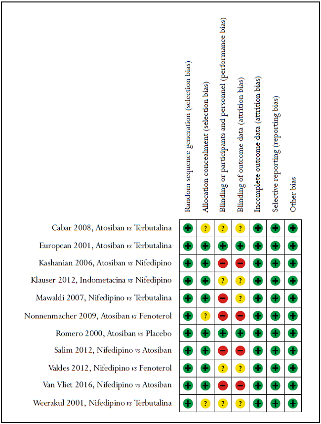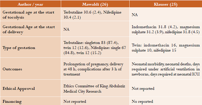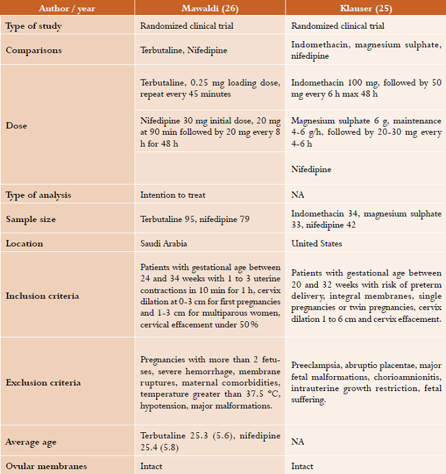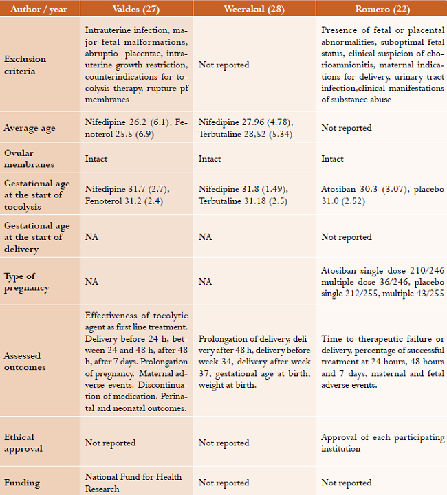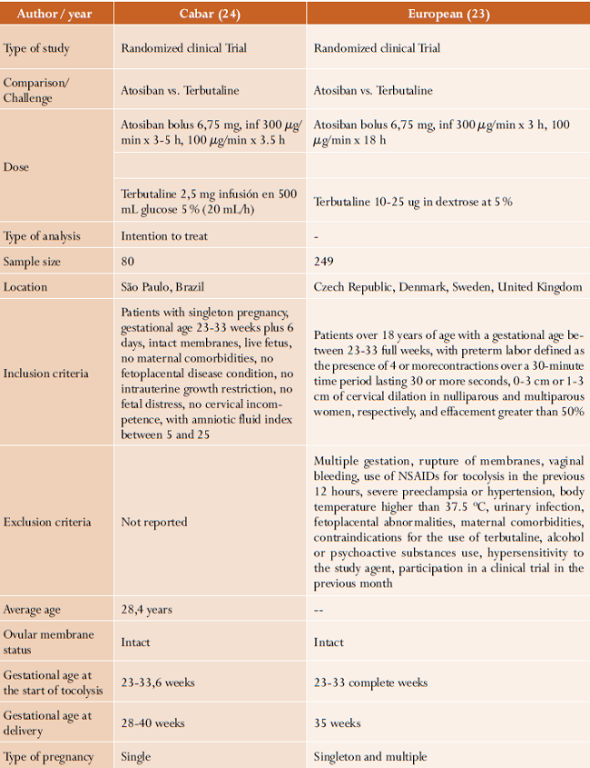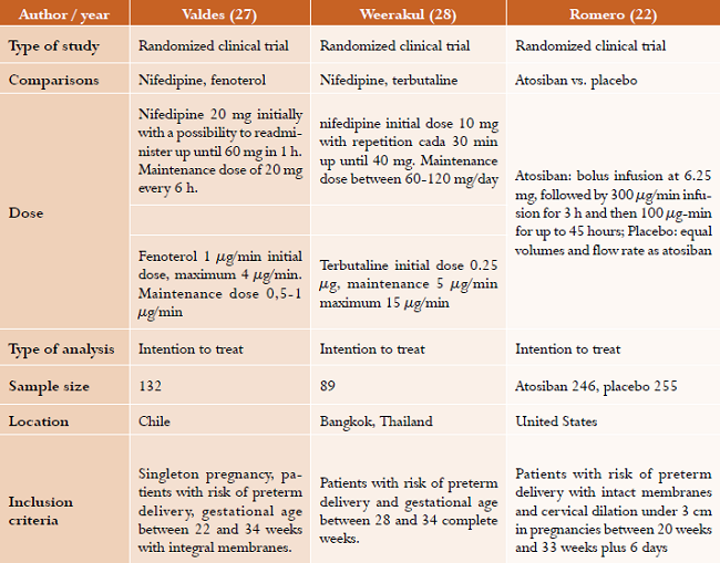 1. Al-Omari WR, Al-Shammaa HB, Al-Tikriti EM, Ahmed KW. Atosiban and nifedipine in acute tocolysis: A comparative study. Eur J Obstet Gynecol Reprod Biol. 2006; 128(1):129-34. Razón de exclusión: no cumple con los criterios de la población estudiada. Incluye pacientes desde la semana 24 hasta la semana 35.
