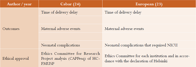 The primary effectiveness outcomes were absence of delivery at 48 hours and at 7 days, and secondary outcomes were the difference in gestational age at the time of delivery. Concerning safety, the primary outcomes were percentage of neonatal mortality and the proportion of maternal adverse events; the secondary outcomes were newborn respiratory distress syndrome, the frequency of intraventricular hemorrhage, the frequency of periventricular leukomalacia, and the percentage of total neonatal complications.