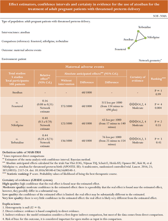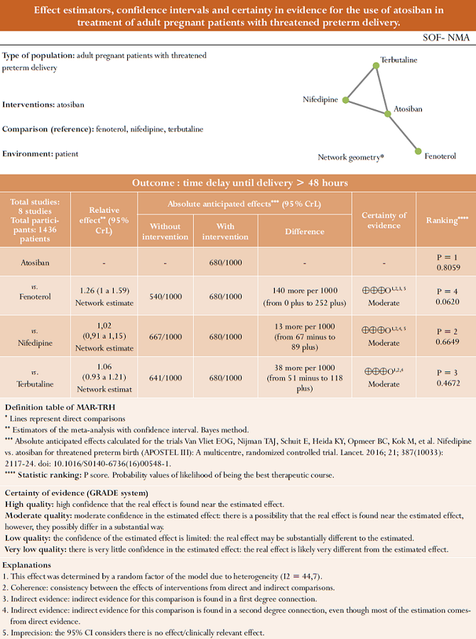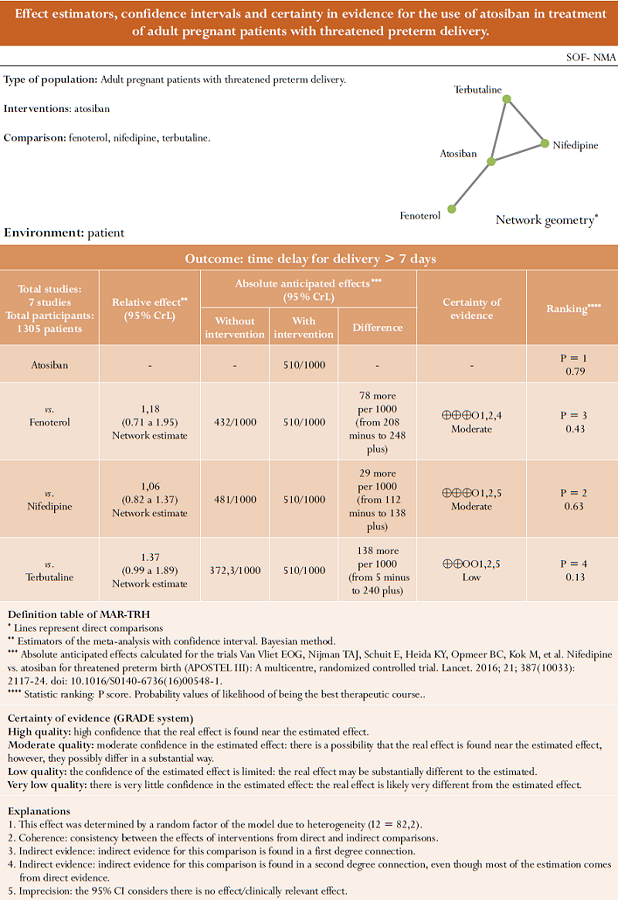 Conclusiones: Atosiban tiene una eficacia similar para retardar el parto ante la amenaza de un parto pretérmino con otros comparadores (certeza moderada), con ventajas frente a indometacina en mortalidad neonatal (certeza baja) y frente a fenoterol, nifedipino y terbutalina en eventos adversos maternos (certeza moderada).