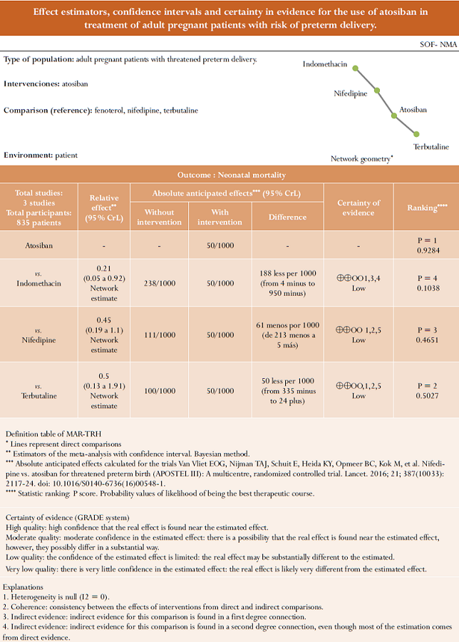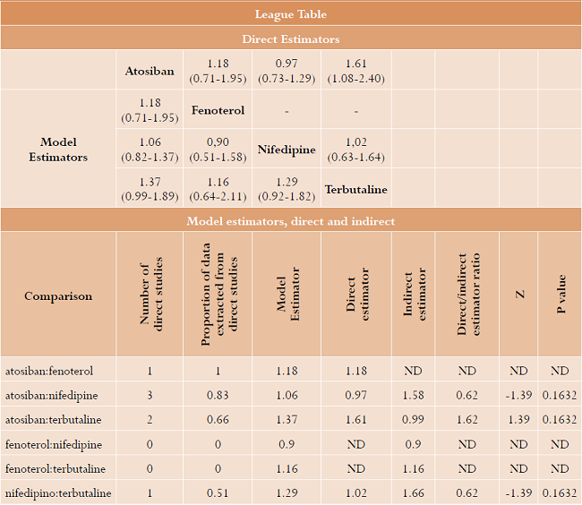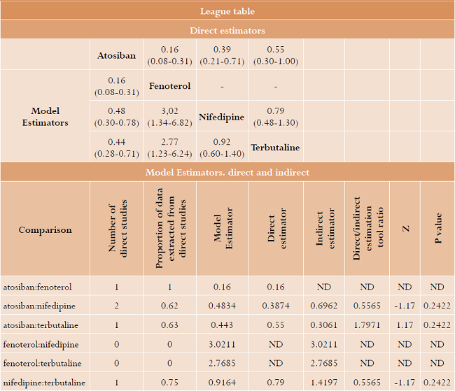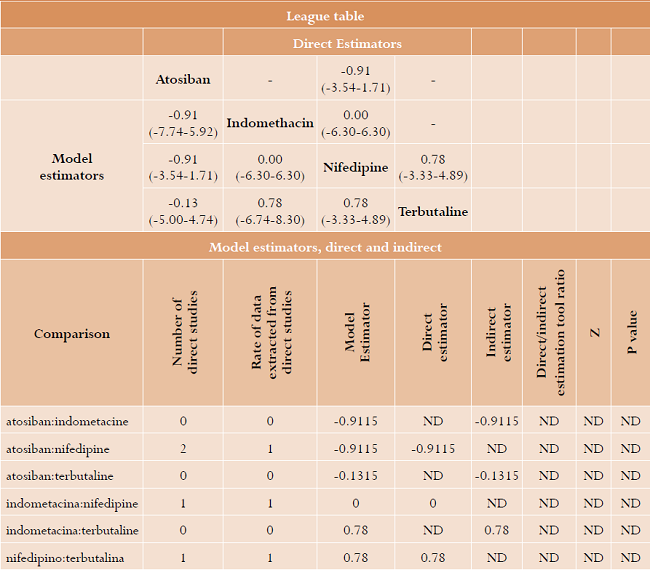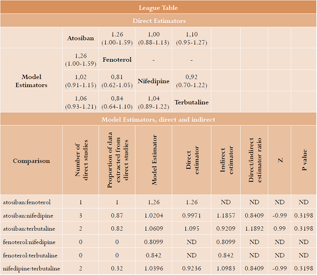 Regarding its weaknesses, it is worth mentioning that the use of network meta-analyses may create weaknesses in the results, given that indirect evidence is of lower quality than direct evidence, broadly speaking. In this specific case, this effect is not necessarily large, given that in nearly all comparisons there was an important percentage of information coming from direct evidence. In addition, the network structure for some outcomes, such as neonatal mortality, implies many comparisons identical to those in direct studies, while indirect data are used only for notifying some outcomes which had no indirect comparison. The fact that Colombian populations are not included in the trials is a potential, though unavoidable limitation, and it possibly has a marginal effect on the results. The restriction of the population to pregnancies between 24 and 33 complete weeks could be considered as a limitation to the inclusion of relevant studies and generalizing results. This may translate into differences with other previous studies. For example, some results differ from those obtained in the meta-analysis carried out by Flenady et al.32, in which it was observed that there is no evidence suggesting atosiban is superior in terms of extending pregnancy when compared to placebo(32). The difference between the Flenady et al. meta-analysis and this trial may be due to the fact that this metaanalysis included two investigations in patients with gestational age outside the range of interest for the present study and outside the one set forth in the health registry. In this case, the information from the composite outcome resulting exclusively from a primary trial was included, which could limit the utility of this conclusion. However, it is useful because it sheds light on a potentially favorable effect of atosiban over placebo.