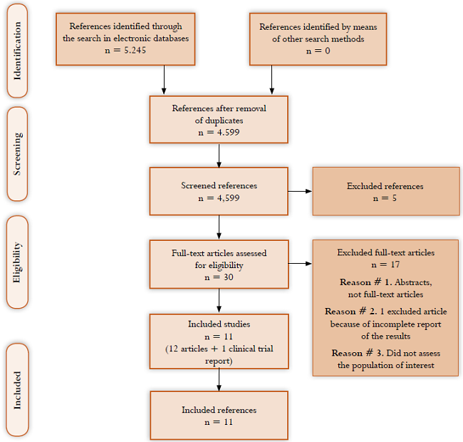 Overall, 5245 references were found as a result of the screening. After removing duplicates, a total of 4599 references were obtained. Of these, 30 which met the inclusion criteria by title and abstract were included for full-text evaluation. Finally, 11 studies20-30 corresponding to randomized clinical trials were selected for inclusion in the qualitative and quantitative analyses. The characteristics of the studies included are described in Annex 2; most were only two-arm studies. All the studies met the gestational age for inclusion in one of the following ways: consideration of the entire range of interest, partial consideration of the range of interest, consideration of a wider range, but reporting the information for the range of interest. The majority of the studies included a population of young women with a mean age ranging between 25 and 30 years. Singleton and twin pregnancies were considered in the majority of the studies. The reasons for reference exclusions are shown in Annex 3. Four records with no results were found in clinicaltrials.gov and 1 reference was a poster report and, for this reason, they were not considered in the results. For another study, there was a record stating that it had been withdrawn before the initiation of the trial. Of the remaining 9 studies, 9 did not represent the inclusion criteria for the populations (reports of gestational ages outside the range considered, excess cervical dilation), and two showed aggregate results for various comparators (beta-agonists together, medications and bedrest grouped together). Figure 1 shows the PRISMA reference screening flow diagram.