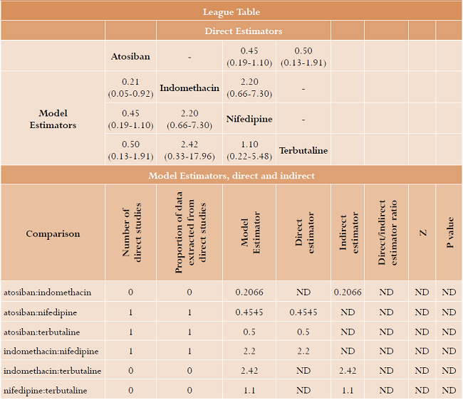 Gestational age at the time of delivery. Four relevant studies were identified for this outcome (23, 24, 27 30), with a total of 849 randomized patients; a network meta-analysis was performed (Table 4). No statistically significant differences were found between atosiban and indomethacin (0.91; 95% CI: -7.74-5.92), nifedipine (-0,91; 95% CI: -3.54-1.71) and terbutaline (-0.13; 95% CI: -5-4.74). In this analysis, I2 was 0%, with an intra-design p value of 0.85 in the Q test, and undetermined inter-design value. There is consistency of direct and indirect comparisons in this case, given the network structure.