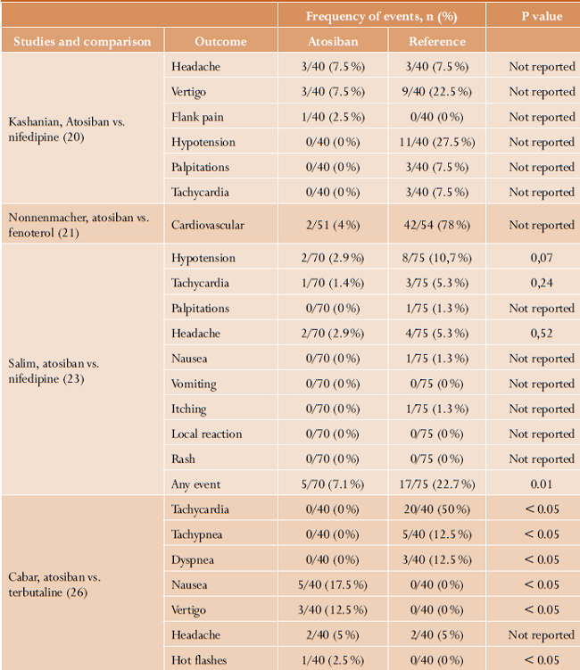 Applicability of the results based on the quality of the evidence. Considering all of the above, it may be said that there are no important differences in effectiveness when compared to other active references (moderate certainty). In terms of the results on neonatal mortality, even though they may show interesting information, it is likely that more and better primary evidence is needed to consider them directly for decision making. However, these results should not be ignored. Results on maternal adverse events show a moderate certainty. There is a decrease in such events when compared to other active comparators. This may have implications for clinical practice. A closer look at reported events (Table 7) clearly shows that the decrease in atosiban-related adverse events is cardiovascular, such as hypotension, tachycardia and the like. This is a potentially important aspect since there are cases in which severe hypotension in the mother is associated with an increase in neonatal morbidity and mortality due to the decrease in placental perfusion2,31. This could imply an assessment by the clinician in order to determine whether the differences in these events may favor atosiban instead of other options. A similar rationale can be used for other reported adverse events.