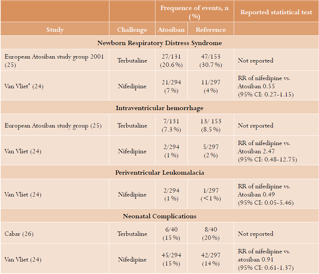 Concerning maternal adverse events, potential reduction of events was found with atosiban compared to fenoterol, nifedipine and terbutaline. It is worth looking closely at the differences regarding specific adverse events versus each comparator to assess whether these have an impact on clinical behavior.