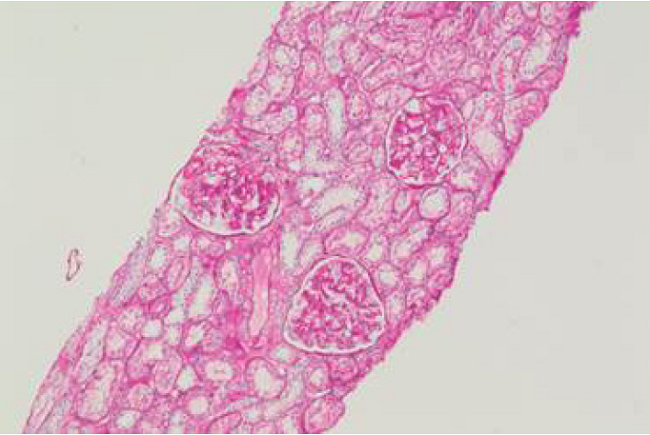 The kidney biopsy showed 18 glomeruli, without global or segmental sclerosis, mesangiocapillary glomerulonephritis, and IgA deposits on immunofluorescence (Figures 1 and 2), leading to the conclusion of IgA nephropathy. Given the severity of the clinical picture, a multidisciplinary team decided to initiate treatment with 3 doses of methylprednisolone, 500 mg daily, followed by prednisolone, 50 mg daily, together with enalapril, 20 mg every 12 hours, furosemide as described previously plus spironolactone, 25 mg every 24 hours, and hydrochlorothiazide, 25 mg daily, in order to improve the nephrotic syndrome.