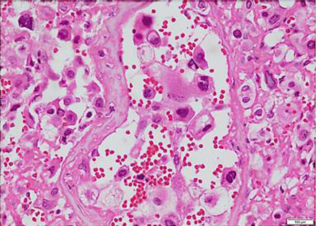 One week later, the pathology report of the D&C confirmed a placental site trophoblastic tumour (Figure 3). The gynaecological oncologist assessed the patient and asked for a follow-up beta-hCG which came back at 668.82 mIU/mL; extension studies were negative for metastatic disease. Given the type of tumour and the high probability of resistance to chemotherapy, the patient was taken to total abdominal hysterectomy plus bilateral salpingectomy through laparotomy. The final pathology report documented a uterine endometrial cavity replaced by a friable tumour mass 8 cm in its longest dimension, with areas of necrotic and haemorrhagic appearance which infiltrated the entire myometrium into the serosa. The microscopic findings were consistent with a placental site trophoblastic tumour of aggressive behaviour due to its size and extensive involvement of the myometrial wall and a focal clear cell component (Figure 3). Immunohistochemistry markers showed tumour cells that were positive for CKAE1/3, inhibin, CD10 and beta-hCG focally, and negative for p63 and p53. The cell proliferation index (Ki67) was 15%.