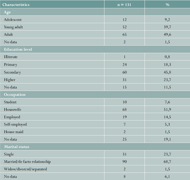 In terms of the main sociodemographic characteristics, it was found that, of the 131 study cases, 49.6% [65/131] of the women who died were adults, 19.1% (25/131) had a low level of schooling, 51.9% [68/131] were housewives, and 68.7% [90/131] were married or in a de facto relationship. Table 1 illustrates the sociodemographic characteristics in detail.