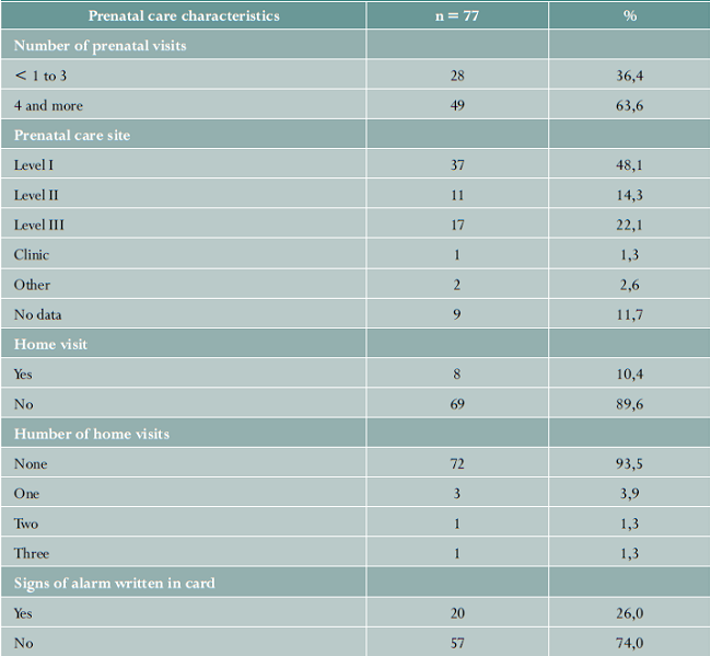Of the total number of women who died, 58.8% [77/131] attended at least one prenatal visit. In terms of prenatal care, 63.6% [49/77] attended 4 or more visits, 26.0% [20/77] had a prenatal card with written information on the signs of alarm that occurred during pregnancy (inadequate weight gain, anemia, short inter-pregnancy interval, excess pregnancy- related vomiting, etc.). Home visits did not take place for 93.5% of the pregnant women. Table 2 shows the distribution of other characteristics of prenatal care. Of the total number of pregnant women studied, 57.3% [75/131] recognized the risk. In 23.7% [31/131] of cases, the women themselves decided to seek help, in 16.8% [22/131] the search for help was initiated by the family, in 9.2% [12/131] it the partner made the decision; no data are available for the remaining percentage of women. Median time between the onset of discomfort and the decision to seek care was 20 minutes; median time between the decision to seek care and arrival at the health- care institution was 20 minutes; and median time between arrival at the institution and receiving care was 7 minutes. Of the women who died, 69.4% [93/131] were admitted to the hospital.