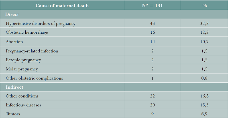 Conclusión: el estudio demostró que la principal causa de MM es la directa, principalmente debido a trastornos hipertensivos del embarazo; la hemo- rragia obstétrica y el aborto, mientras que en menor proporción fueron las MM indirectas, principal- mente enfermedades infecciosas.