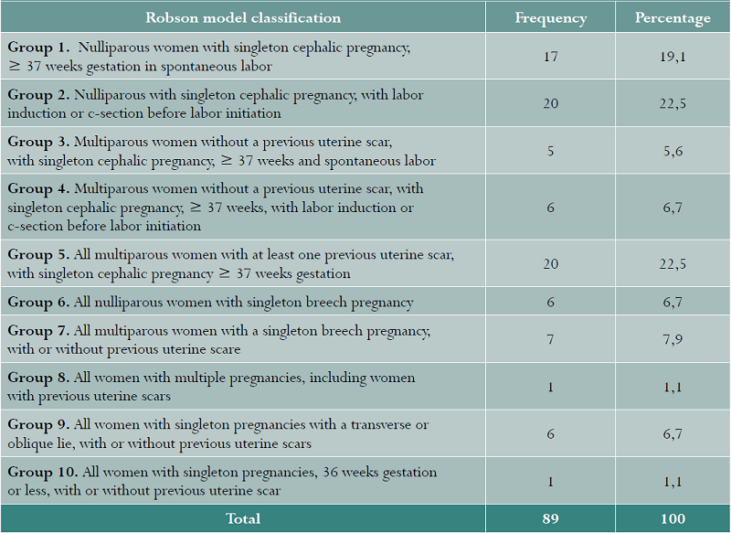 The strengths of this study include the use of a probabilistic random selection and the application of the tool exclusively by the author. This ensures uniformity at the time of applying the Robson model for the classification. In terms of limitations, the study period was short and it could have been extended had more resources been available. Additionally, pregnant women who did not undergo c-sections were not included as was the case in other Latin American reports 11, since only patients taken to c-section were included.