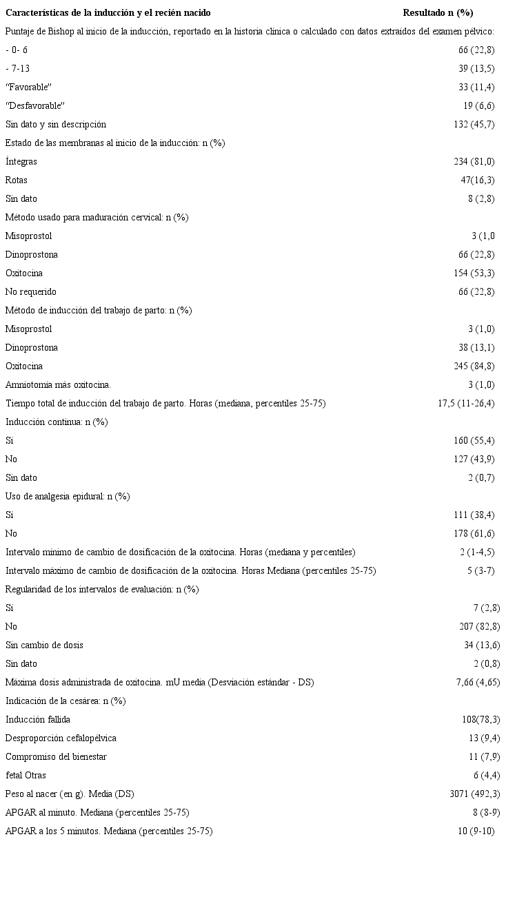 En 19 (6,6 %) se encontró el valor del puntaje de Bishop consignado en la historia clínica y 86 (29,8 %), aunque no tenían el puntaje directamente consignado en la historia clínica, contaban todos los parámetros necesarios para calcularlo. A 52 (18 %), el equipo tratante solo les asignó una calificación cualitativa, como cérvix favorable o desfavorable, y 132 (45,7 %) no tuvieron ningún dato que permitiera aproximarse a alguna clasificación. Un total de 66 (22,8 %) mujeres tuvieron criterios objetivos para considerarlas con puntaje de Bishop desfavorable, 54 de estas (81,8 %) recibieron algún método de maduración cervical y las otras 12 (18,2 %) recibieron oxitocina con esquema de inducción desde inicio (considerado como no pertinente). De estas mujeres con cérvix desfavorable en que se realizó maduración cervical, en 15 (27,8 %) se utilizó di- noprostona y en 39 (72,2 %) oxitocina, con dosis bajas e incrementos espaciados, lo cual no se calificó como incorrecto, a pesar de no ser el método ideal. Finalmente, 32 de las 66 mujeres (48,5 %) con cérvix desfavorable y 27 de las 39 (69,2 %) con cérvix favorable tuvieron parto vaginal. En la Tabla 2 se presentan las características de la inducción y algunas características del recién nacido.