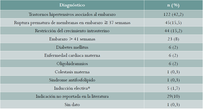 La mediana de edad de las mujeres incluidas fue 24 años (RIC 20-31), 158 (54,6 %) eran nulíparas, 156 (53,9 %) tenían entre 37 y 38 semanas de gestación, 108 (37,3 %) entre 39 y 40, 23 (7,95 %) tenían 41 semanas y 2 (0,69 %) tenían 42 o más. La Tabla 1 presenta las indicaciones de inducción de trabajo de parto; 29 (10 %) tuvieron indicaciones no reportadas en la literatura: embarazo de 40 semanas, polihidramnios, comorbilidades asociadas como VIH, epilepsia, infección urinaria recurrente, trombocitopenia gestacional, masa ovárica, anemia de células falciformes y malformaciones fetales como megacisterna magna y tetralogía de Fallot. Un total de 149 (52 %) tuvo parto vaginal espontáneo, 2 (0,7 %) tuvieron parto instrumentado y 138 (48 %) parto por cesárea. Por otra parte, 96 de las 158 nulíparas (60,8 %), grupo 2a de Robson, y 42 de las 131 multí- paras (32,1 %), grupo 4a, tuvieron parto por cesárea.