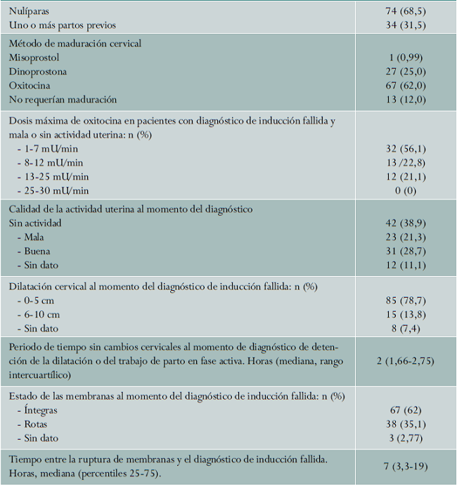 La dosis máxima de oxitocina fue menor de 8 mU/ min en la mitad de las mujeres con diagnóstico de inducción fallida, ninguna llegó a la dosis máxima de 30 mU/min a pesar de no tener buena actividad uterina y algunas permanecieron con la misma dosis a pesar de no tener progresión. En ninguno de los casos de inducción fallida se cumplieron de manera simultánea todas las recomendaciones para su adecuada realización, por tanto, se catalogaron como inducciones mal conducidas. En la Tabla 3 se presentan otras condiciones características de los casos considerados como inducción fallida. Si en vez de utilizar el criterio más actualizado para definir trabajo de parto activo, 6 cm de dilatación, se hubiera utilizado el previo, 4 cm, la proporción de mujeres con diagnóstico de inducción fallida antes de llegar a la fase activa sería igualmente alta, 66 (61,1 %).