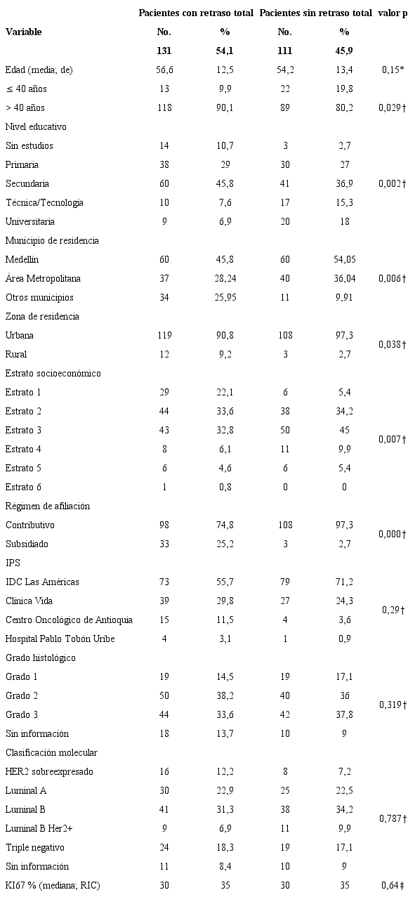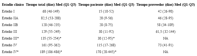 La mayoría de las pacientes (85,5 %) eran mayores de 40 años, residentes en zona urbana (94 %); en relación con el nivel educativo se identificó que el 28 % terminó la primaria y el 42 % la secundaria, y solo el 23 % tienen alguna profesión o cursaron un tecnológico. Al comparar las pacientes con y sin retraso se encontraron diferencias significativas entre los dos grupos en nivel educativo (p:0,002), municipio, zona de residencia (p:0,006), estrato socioeconómico (p:0,007) y el régimen de aseguramiento al Sistema General de Seguridad Social (p:0,000). El 77,7 % de las pacientes consultó al médico en un tiempo menor a tres meses y solo 26,5 % tuvieron un diagnóstico oportuno (menor a un mes). Al evaluar los tiempos, se encontró que tanto los días totales para hacer el diagnóstico como los tiempos de la paciente y del proveedor fueron progresivamente más altos a medida que el estadio clínico era de mayor gravedad (tabla 2).