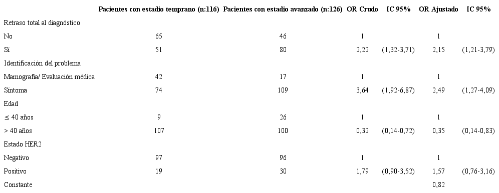 Materiales y métodos: estudio de corte transversal con mujeres mayores de 18 años con cáncer de mama que consultaron en cuatro centros oncológicos de Medellín, Colombia, en 2017. Se usó el Breast Cancer Delay Questionnaire que incluye variables sociodemográficas, clínicas y de tiempos de atención. Se estimó el odds ratio (OR) crudo y ajustado por medio de una regresión logística con el estadio clínico avanzado como desenlace y el retraso diagnóstico como exposición.