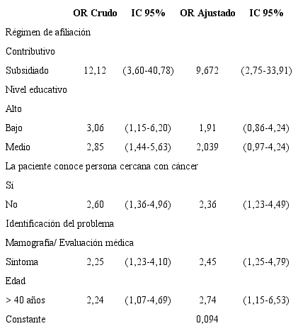 Análisis para la asociación con retraso total en el diagnóstico: este estudio encontró que estar afiliada al régimen de seguridad social es un factor de riesgo para presentar retraso total en el diagnóstico (OR = 9,67; IC 95 %: 2,75-33,91), en comparación con las afiliadas al régimen contributivo; otros factores asociados a la demora en el diagnóstico fueron ser mayor de 40 años (OR = 2,74; IC 95 %: 1,15-5,63) y el reconocimiento del problema por un síntoma (IC 95 %: 2,45; 1,25-4,79) (tabla 5).