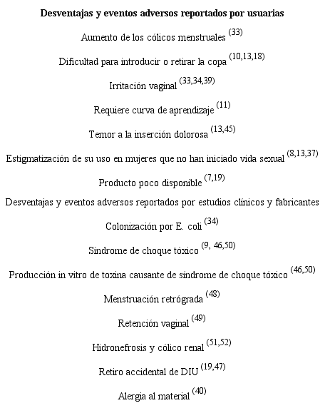 Se encontró un caso publicado de retención vaginal 49, dos de hidronefrosis secundaria al atrapamiento mecánico del uréter que resolvió inmediatamente retirada la copa 51,52 y un caso grave confirmado asociado a síndrome de choque tóxico 50. Un estudio vincula su uso como factor de riesgo para el mismo, pues se realizó aislamiento in vitro de la toxina de síndrome de choque tóxico 1 (TSST-1) en tres de las cuatro copas evaluadas 46. En 2017, en Dharpur, India, se estudió una cohorte prospectiva con 158 mujeres entre 21 y 50 años, una participante reportó alergia al producto 40. También se ha investigado si su utilización incrementa el riesgo de expulsión de dispositivos intrauterinos (DIU). Un estudio observacional canadiense, en 135 usuarias de la copa y el dispositivo intrauterino no encontró una asociación significativa 19; sin embargo, una serie de siete casos de retiro accidental durante la extracción manual de la copa fue descrita recientemente en población estadounidense 47. Es de resaltar que el retiro accidental fue advertido por todas las mujeres. El manejo posterior para las que eligieron continuar usando la copa menstrual consistió en cambiar de método anticonceptivo o la reinserción del DIU cortando los hilos en proximidad al cérvix. En las tablas 2 y 3 se presenta una síntesis de las ventajas y desventajas reportadas sobre el uso de la copa menstrual.