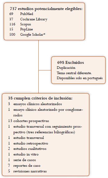 Se encontraron 737 títulos para revisión inicial con la estrategia de búsqueda mencionada: 69 en Medline, 37 en Cochrane Library, 116 en Scopus, 15 en PopLine y se revisaron 500 títulos de Google Scholar. Un total de 699 artículos fueron descartados mediante título y resumen debido a que no cumplían con los criterios de inclusión o por duplicación de la referencia. Cuatro artículos fue- ron descartados debido a que estaban escritos en portugués de Portugal. Finalmente, en esta revisión fueron incluidos 38 artículos: tres ensayos clínicos aleatorizados 21,32,33, un ensayo aleatorizado por conglomerados 34, 13 cohortes prospectivas 6,11-13,18,35,42, un estudio transversal con seguimiento prospectivo (que se publicó en tres referencias) 10,43,44, un estudio transversal 38, un estudio retrospectivo 19, dos estudios cualitativos 20,45, un estudio in vitro 46, una serie de casos 47, siete reportes de caso 16,17,48,52, y cinco revisiones narrativas 2,7,15,23,53 (figura 1, tabla 1). Se pudieron obtener todos los artículos seleccionados para lectura completa. No se encontraron ensayos clínicos ni estudios descriptivos realizados en América Latina.