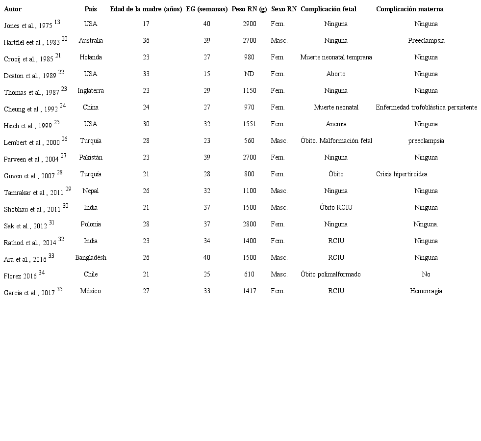 En cuanto a las complicaciones maternas reportadas: preeclampsia en 6 casos 6,23,28,31,34,40, un caso de hemorragia posparto que requirió histerectomía 27, enfermedad trofoblástica persistente en 3 casos 4,23, un caso con crisis hipertiroidea (41); no se presentaron casos de sepsis o mortalidad materna.