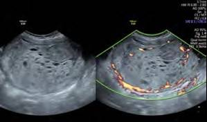 El ultrasonido obstétrico de detalle anatómico arroja los siguientes resultados: peso estimado fetal, 830 g; crecimiento menor del percentil 3 para la edad gestacional. En la valoración de la placenta se encuentra una imagen de 90 x 167 mm, con múltiples imágenes hipoecoicas en patrón de panal de abejas, sugestiva de enfermedad trofoblástica gestacional (figuras 1 y 2). La valoración de líquido amniótico confirma oligoamnios (ILA 3). En la evaluación Doppler se descarta acretismo placentario. El Doppler de hemodinamia fetal muestra aumento de resistencia en arteria umbilical. Resistencias normales en arteria cerebral media y ductus venoso. La valoración fetal evidencia feto de sexo femenino, con lesión focal hepática en lóbulo derecho de 25 x 26 mm, hipoecoica irregular, con septos pequeños y sugestiva de hamartoma mesenquimatoso hepático (figura 3); resto de la anatomía fetal normal. Se realiza una impresión diagnóstica de gestación de 33 semanas, preeclampsia sin criterios de severidad, enfermedad trofoblástica con coexistencia de feto vivo, restricción de crecimiento
