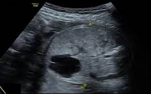 Había iniciado su control prenatal desde la semana 16, cuando se registró un peso de 53 kg y talla 160 cm. Laboratorios obligatorios del control prenatal normales y hormona tiro estimulante (en inglés TSH) dentro de límites normales. Traía tres ultrasonidos de su control prenatal. Ultrasonido semana 16: feto con anatomía normal, líquido y placenta normales. Ultrasonido semana 22: feto con quiste hepático, líquido amniótico normal y lesión placentaria sospechosa de acretismo placentario. Ultrasonido de semana 32: restricción de crecimiento intrauterino: biometría para 28 semanas, oligoamnios (ILA 4 cm). Placenta con sospecha de acretismo placentario.