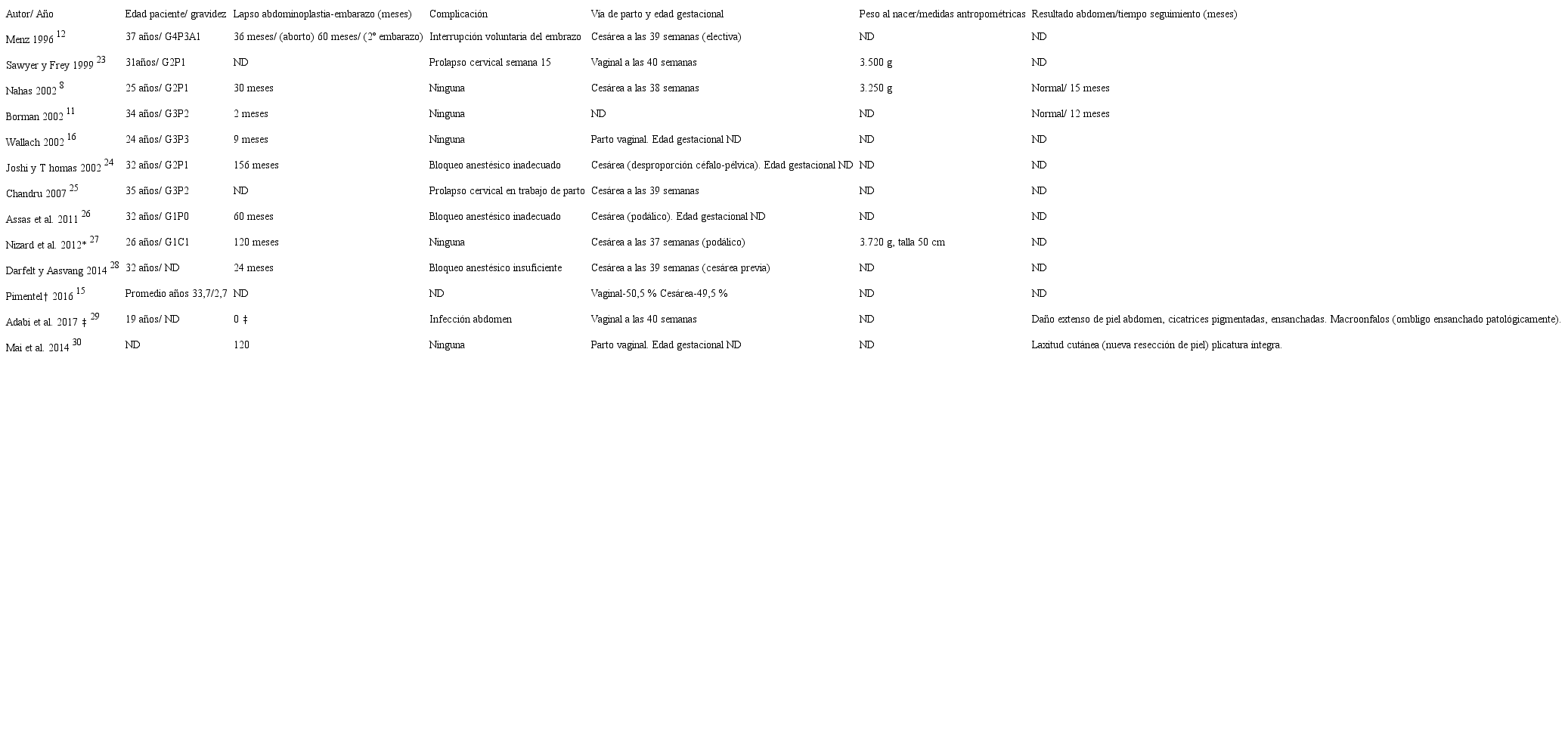 Un estudio informó el caso de una paciente a quien se le realizó la abdominoplastia con embarazo inadvertido al momento del procedimiento; la cirugía se complicó con infección subaguda del sitio operatorio por mycobacterium29. Exceptuando este reporte de caso, el rango desde la realización de la abdominoplastia hasta el inicio de la gestación fue de 2 meses 11 a 13 años 24. Once estudios describieron la vía de parto, siendo siete por cesárea 8,12,24,28 y cuatro por vía vaginal 16,23,29,30. La indicación de la cesárea fue por presentación podálica en dos casos 26,27; cesárea previa 28; desproporción cefalopélvica 24 prolapso agudo del cuello uterino 25, y finalmente dos cesáreas en las que no se indicó la causa 8,12 (tabla 1).