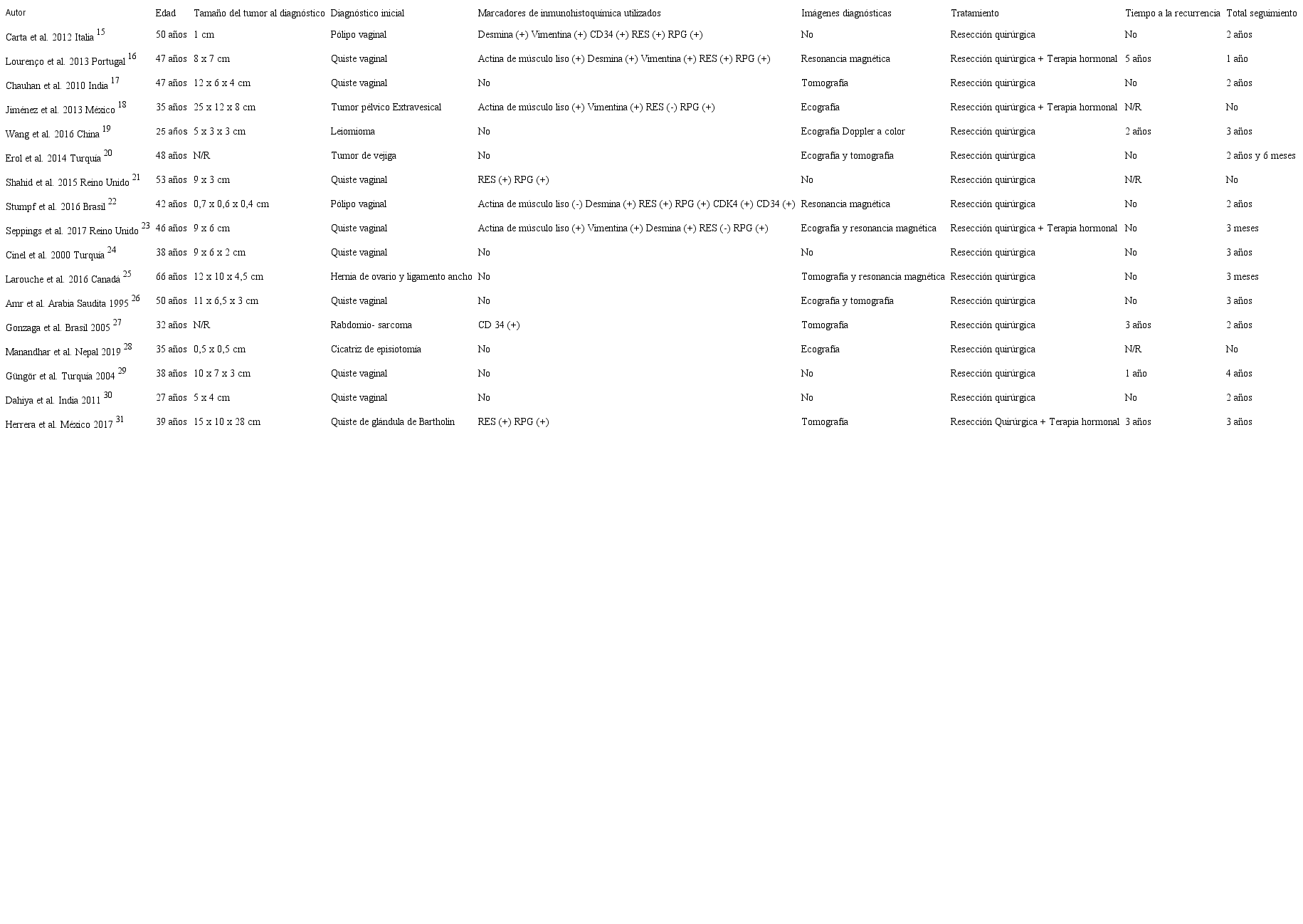 En cuanto a los síntomas se identificó que seis de los casos reportaron masa dolorosa 16,18,19,23,28,31, en cinco casos se presentaron alteraciones durante la micción 17,19,20,21,25, en tres casos sensación de cuerpo extraño en vagina 17,18,28, dispareunia en dos casos 18,30 y un caso en el que se reportó dificultad para la deambulación 18. El tumor fue inicialmente diagnosticado como otra enfermedad del tracto genitourinario en todos los casos, previo a la confirmación diagnóstica por histopatología (tabla 1).